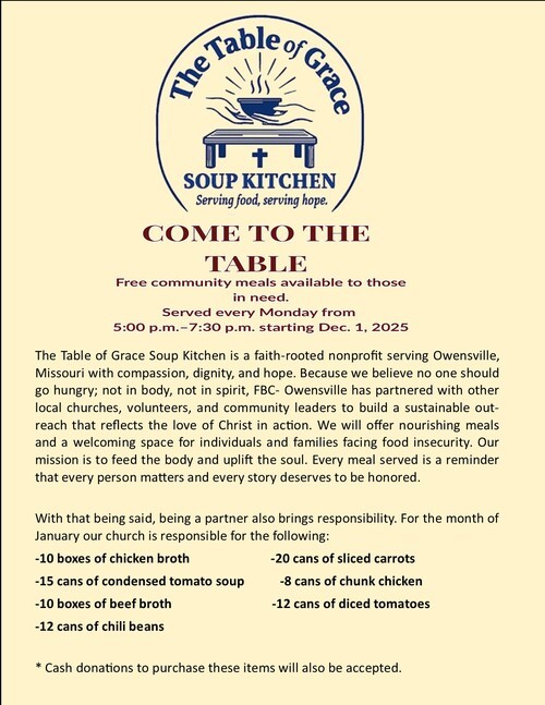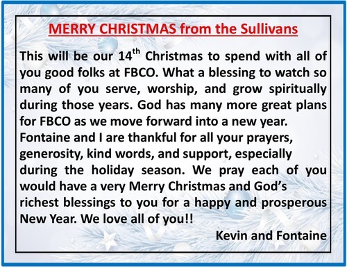 Offering Envelopes for 2026 have been distributed either to your Sunday School room or on the table at the entrance of the FLC. If you do not have envelopes and would like a box, please notify the church office.